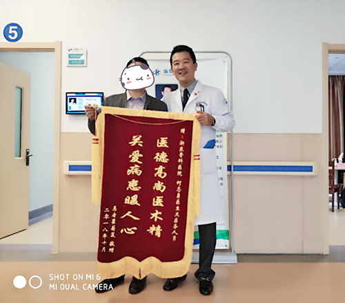 患者为一名老太太,40年前左髋外伤导致骨骺滑脱骨性关节炎,行走和爬楼梯疼痛明显,关节外科中心何志勇主任给予行人工髋关节置换术,患侧下肢延长了3.5厘米,术后第二天即可扶拐杖行走,老太太对术后效果非常满意,喜出望外!特地在术后1个月回院复查时由其儿向何主任赠送锦旗以表谢意。